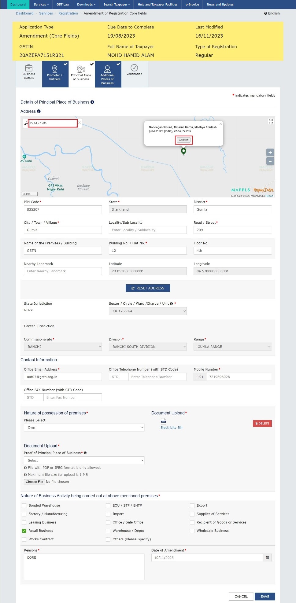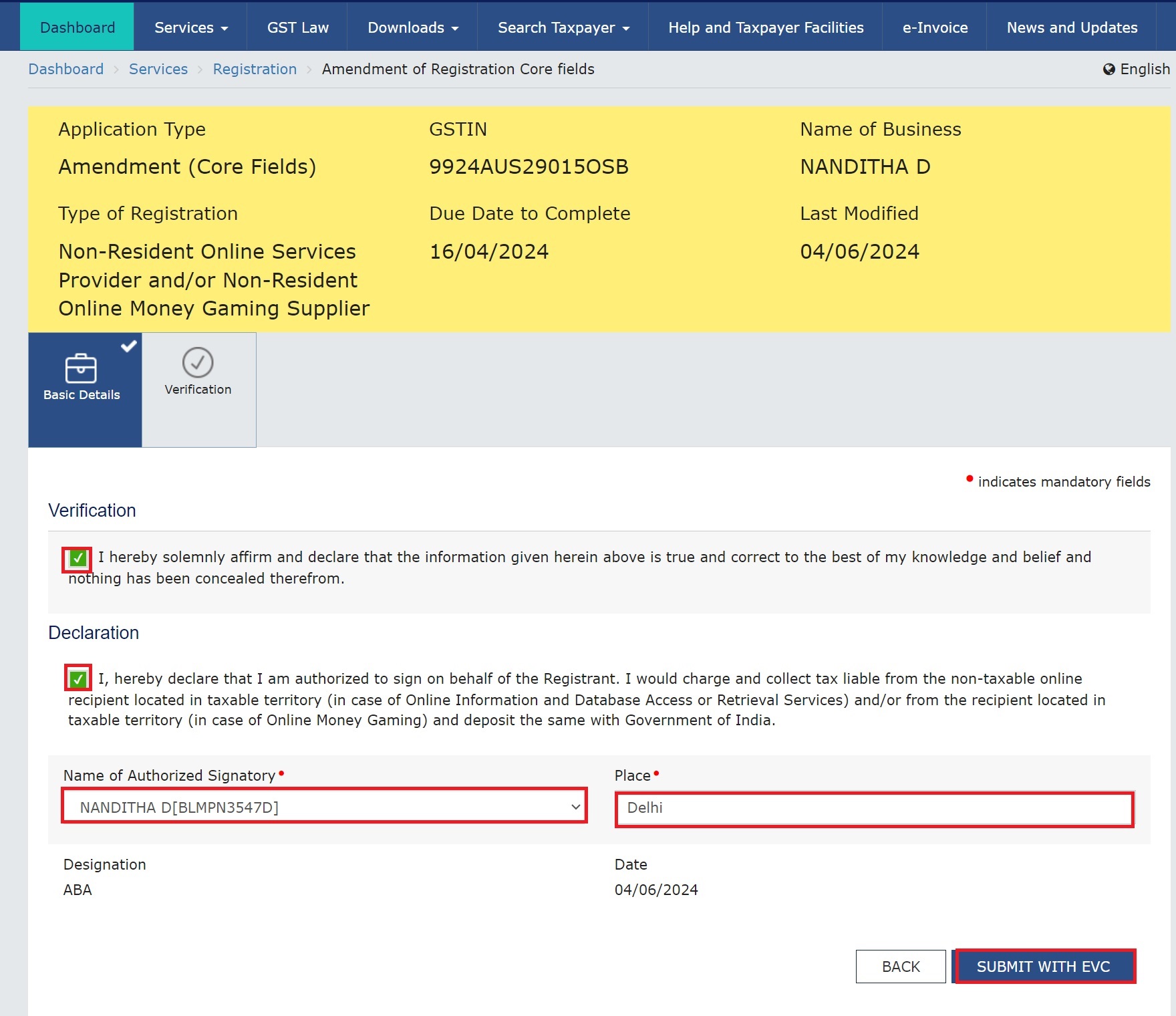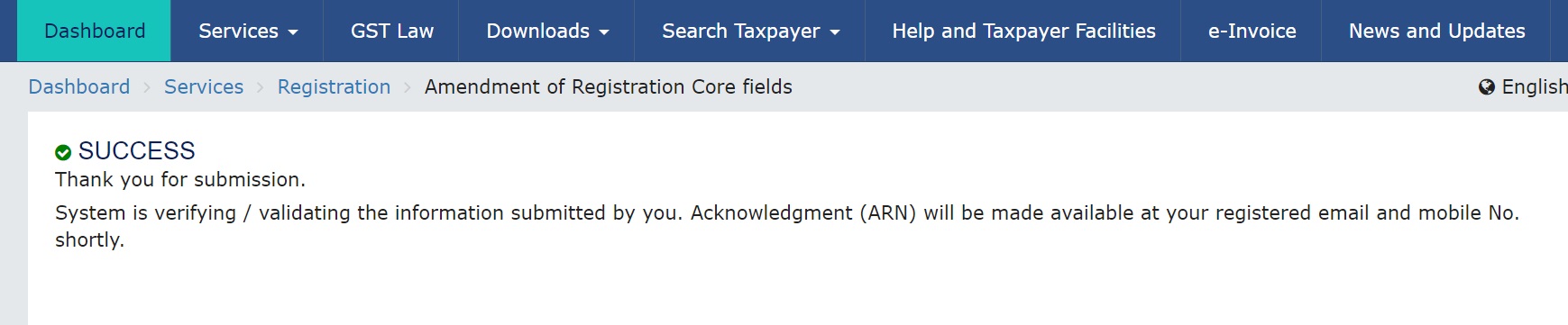 Step 6: On successful submission of the application, a message will be displayed on the screen stating ‘Successful submission’. An acknowledgement will be sent on the registered email address and mobile number within 15 minutes. The amendment to core fields requires approval by the tax official. Also, a message of application approval or rejection by a tax authority will be sent by SMS and email to the register email ID and mobile number.