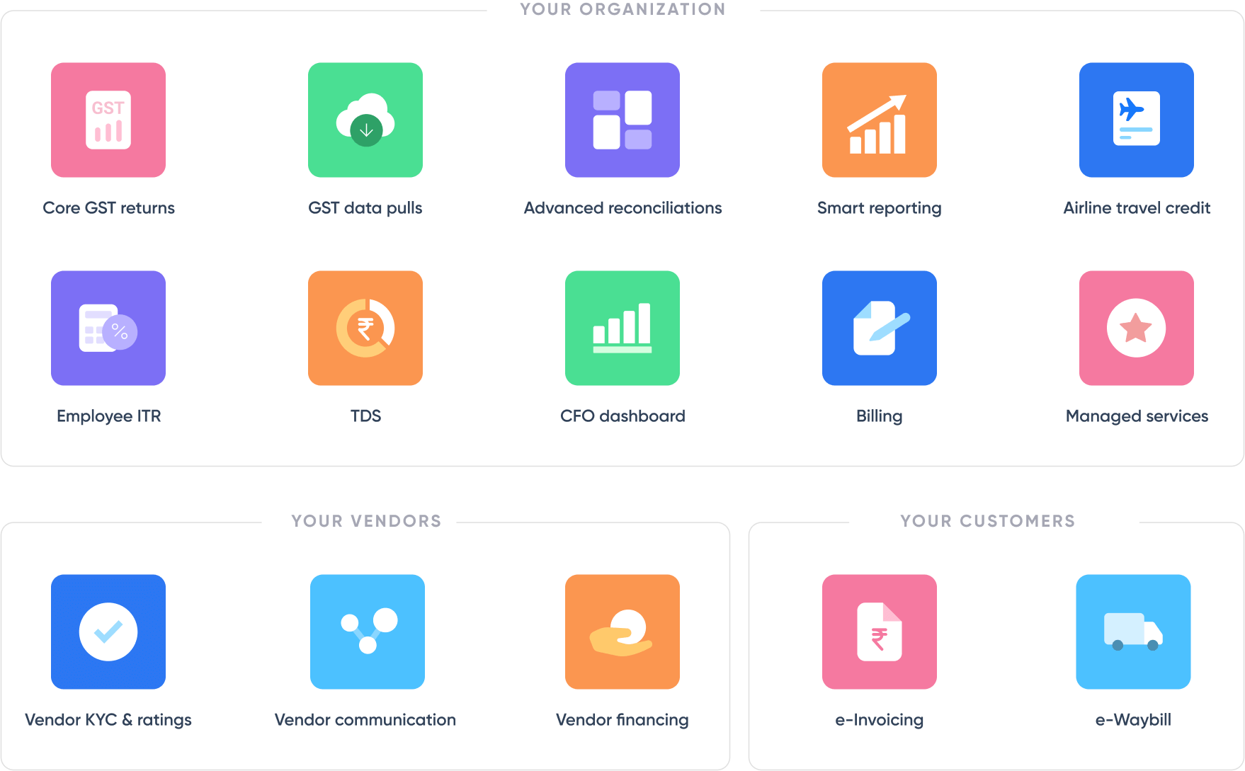 Our product suite covers the entire value chain from your vendors to your organization and your customers, from core tax platform such as GST to network needs such as e-Invoicing
