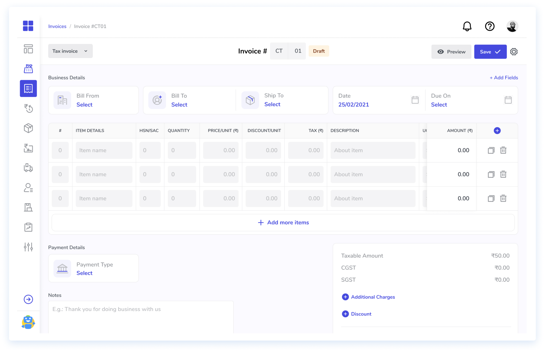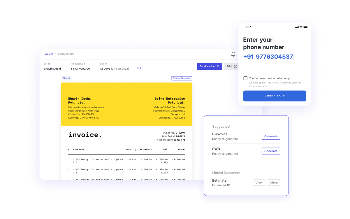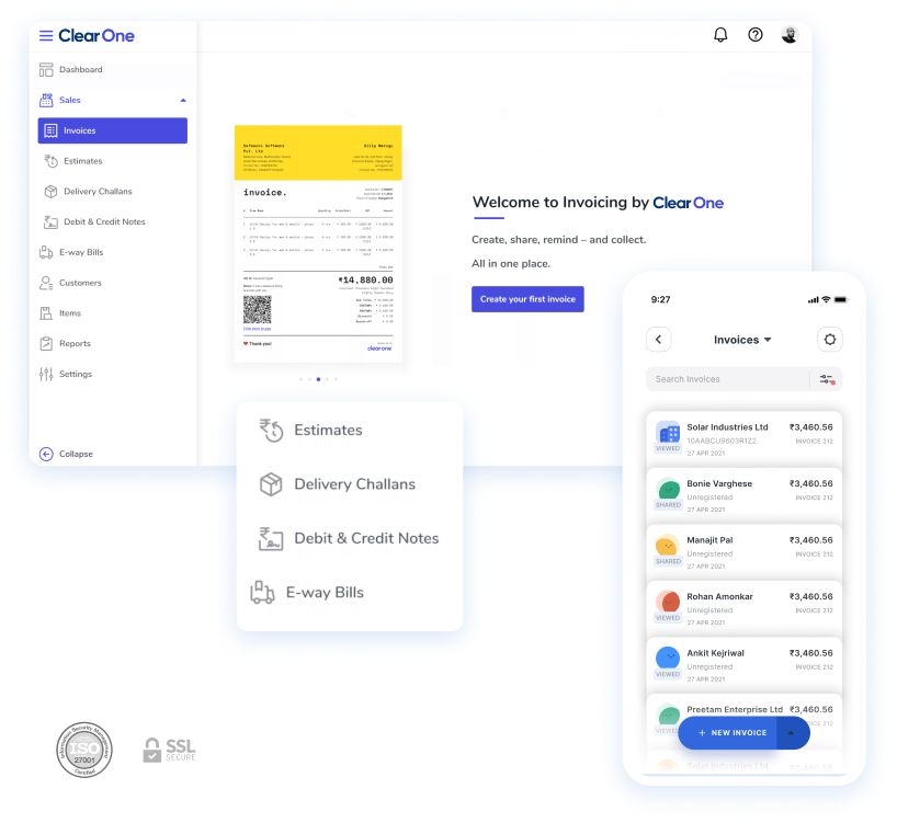 Get your invoices, e-Invoices, delivery challans, estimates, bills of supply and many more in one place. Track everything from a single dashboard.
