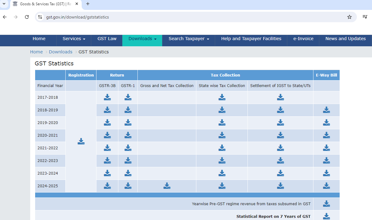 This tab consists of a list of links to the Central Board of Indirect Taxes and Customs (CBIC) and states/UT commercial tax websites. The links host CGST Act and rules, SGST Act, rules, latest GST notifications, amendments and circulars.