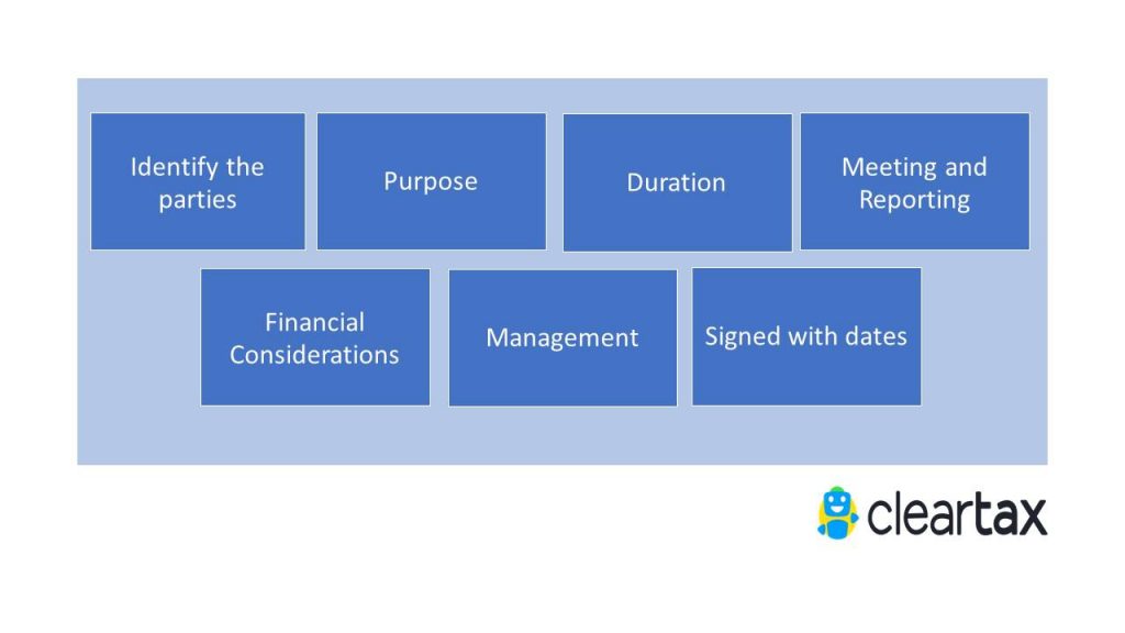 Financial considerations: The memorandum should specify the amount of capital contribution to be made by the parties. It should also mention the person authorized to make the major financial decisions. The financial record keeping of the assignment/program being undertaken should also be maintained.
