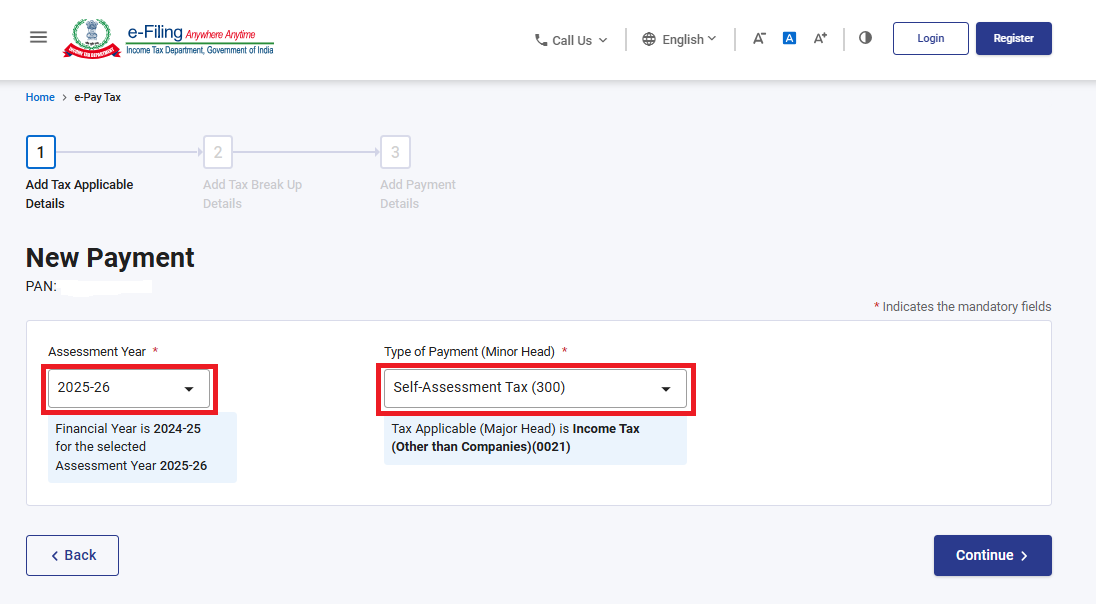 Step 3: Select the correct Assessment Year and Payment Type