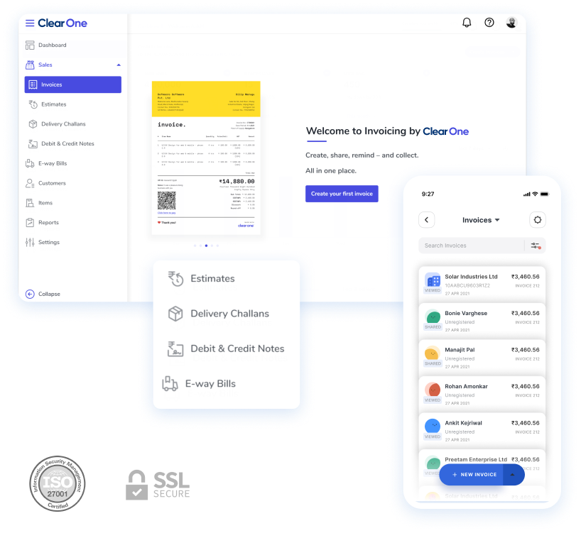 Get your invoices, e-Invoices, delivery challans, estimates, bills of supply and many more in one place. Track everything from a single dashboard.
